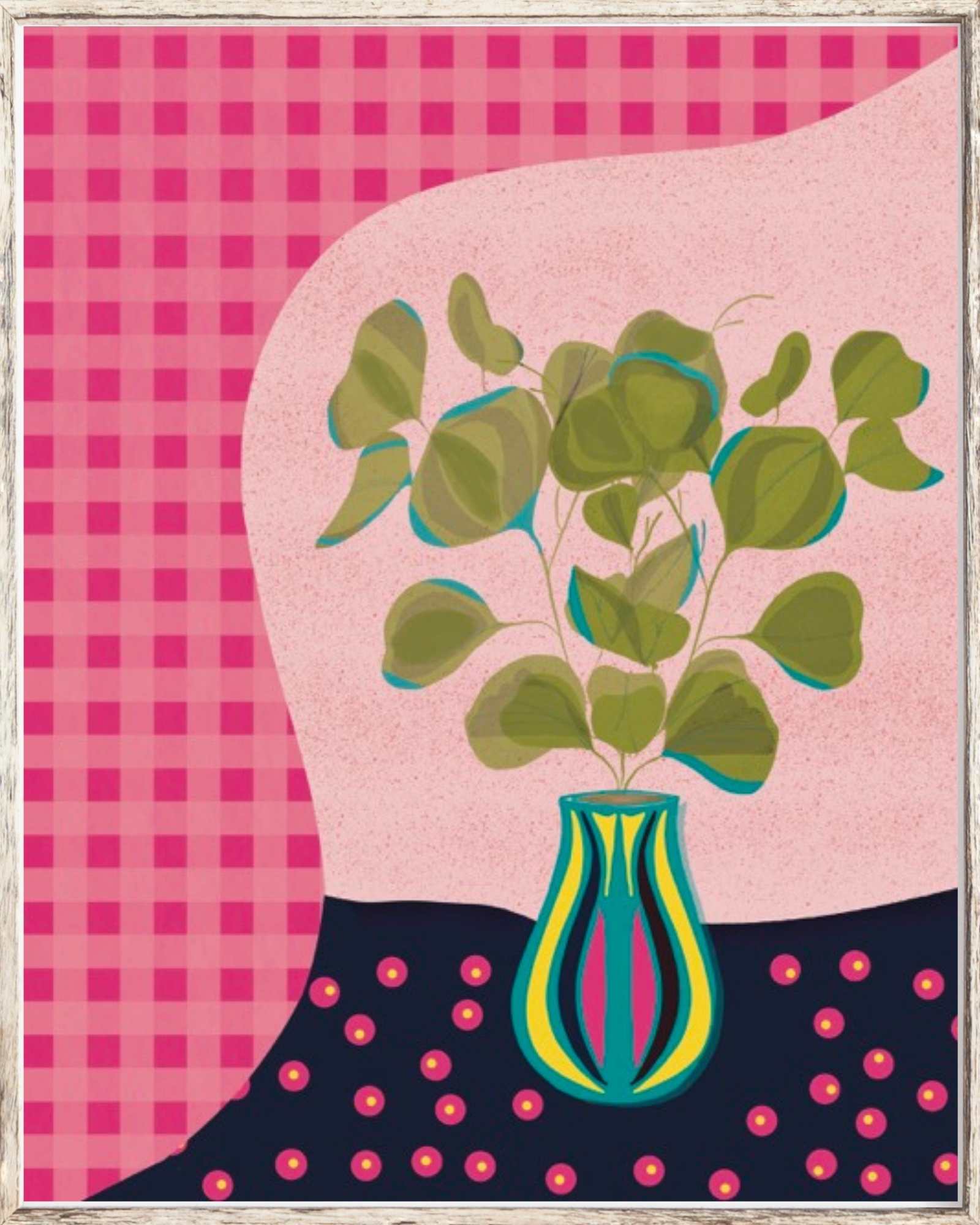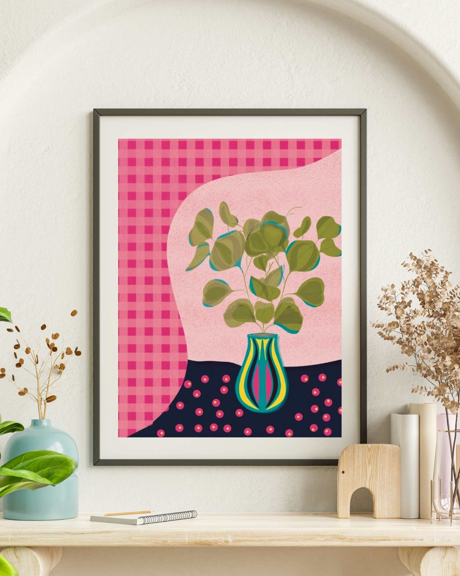 This soft and soothing eucalyptus print in warm pink tones adds a fresh, feminine touch to your decor. Delicate brushstrokes highlight the graceful shape of each leaf, offering calm and quiet charm. It pairs beautifully with minimalist or botanical-themed spaces like bathrooms, bedrooms, or nurseries.