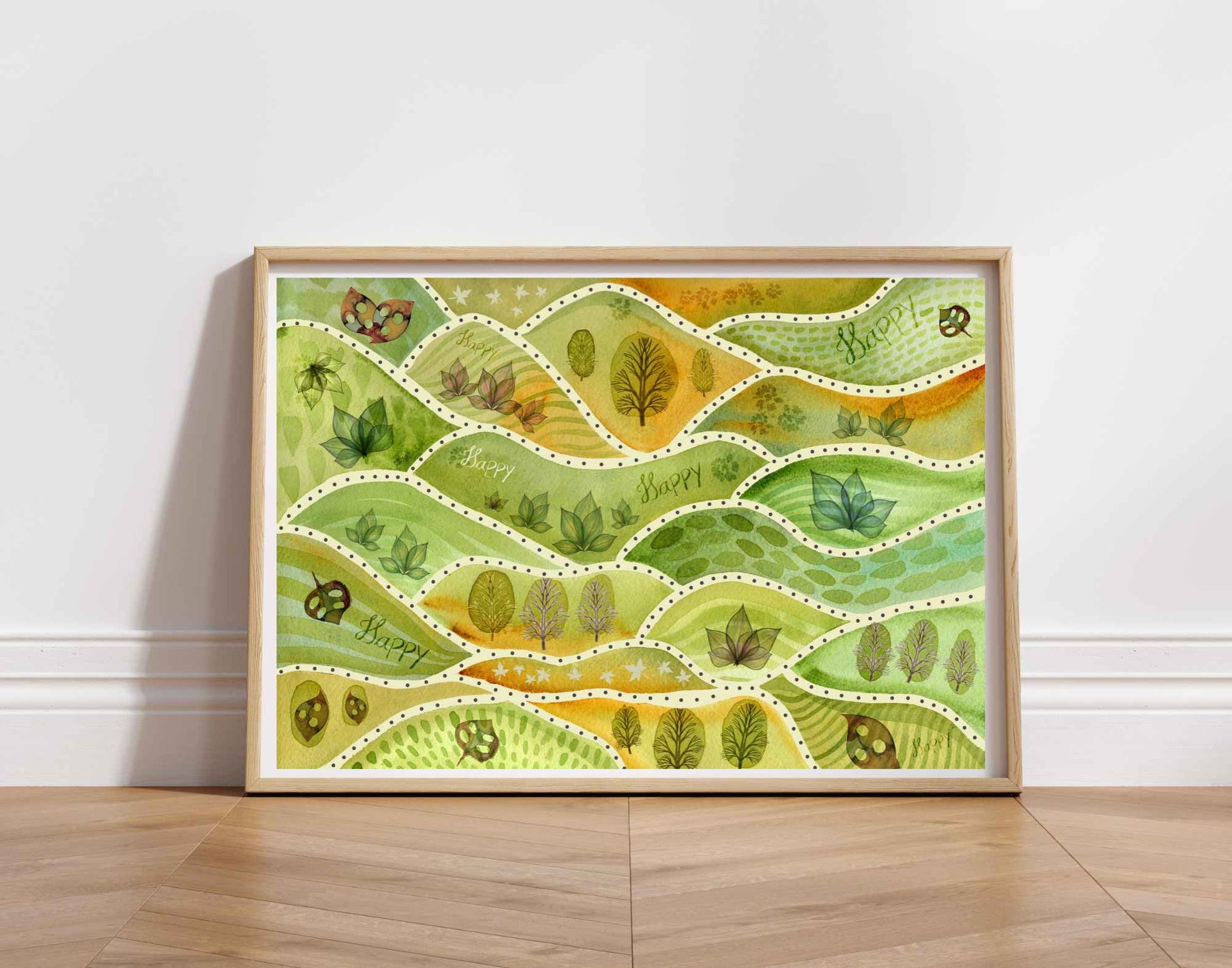 Let your walls breathe with calm energy and uplifting color through this Watercolor Happiness Mountains print. Painted in flowing layers of translucent watercolor, this serene landscape captures the quiet joy of nature’s grandeur. A perfect match for meditation spaces, cozy nooks, or anywhere you want to bring in a peaceful, reflective vibe.