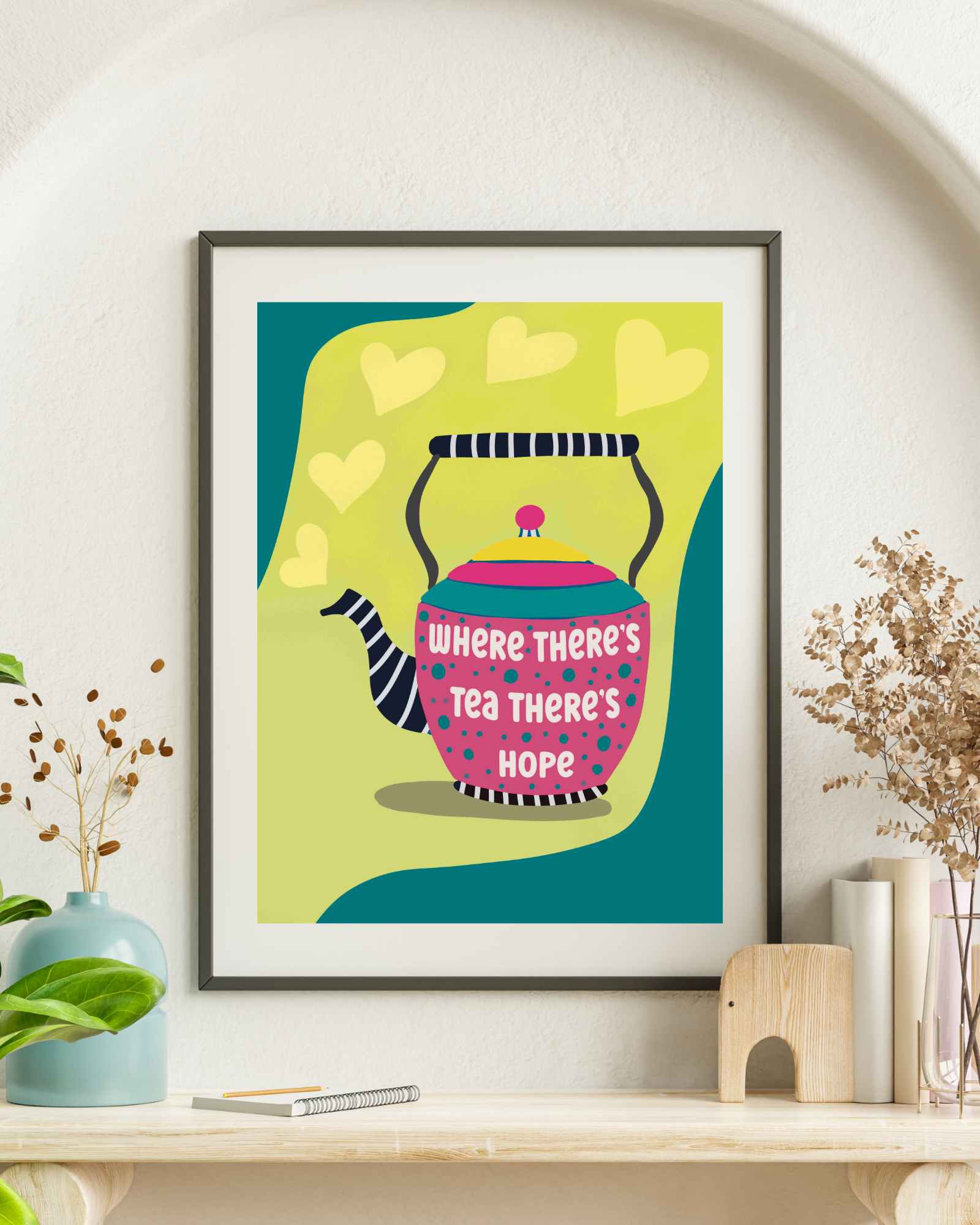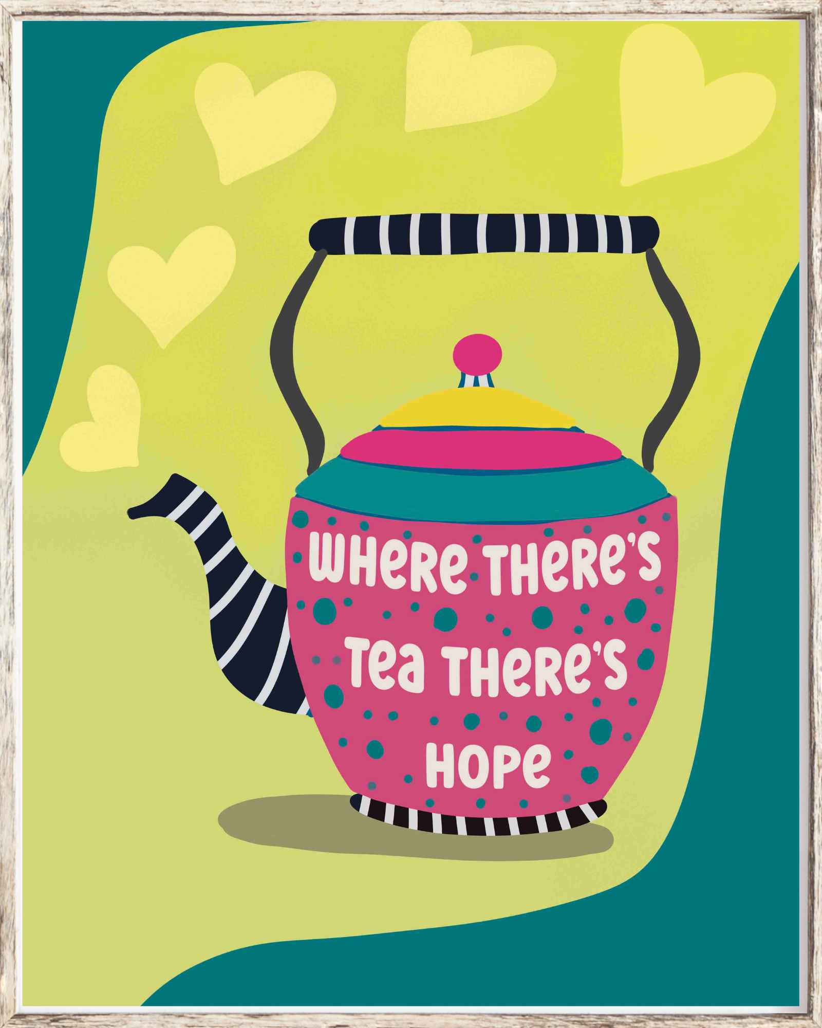 This whimsical tea-inspired artwork blends bold color with everyday joy, perfect for those who see tea time as a sacred pause. From tiny teapots to blooming herbs, each detail adds charm and heart. It’s ideal for brightening your kitchen walls, breakfast nook, or as a thoughtful gift for your favorite tea enthusiast.