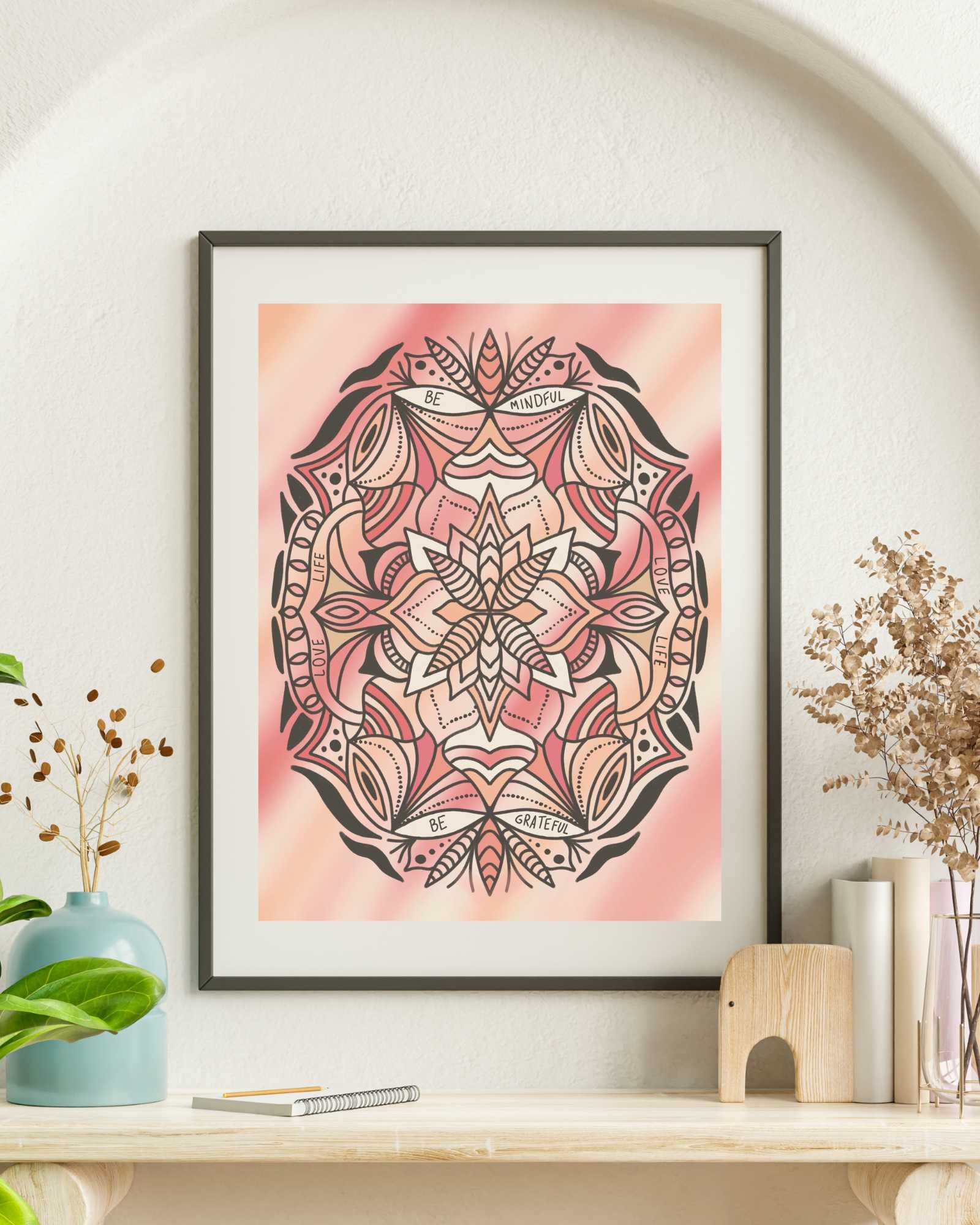 Transform your space with the serene beauty of this "Be Mindful, Be Grateful" mandala art print. This captivating piece features an intricate design with soft, soothing colors that evoke a sense of peace and mindfulness. Perfect for any room in your home or office, this artwork serves as a gentle reminder to practice mindfulness and gratitude in your daily life.