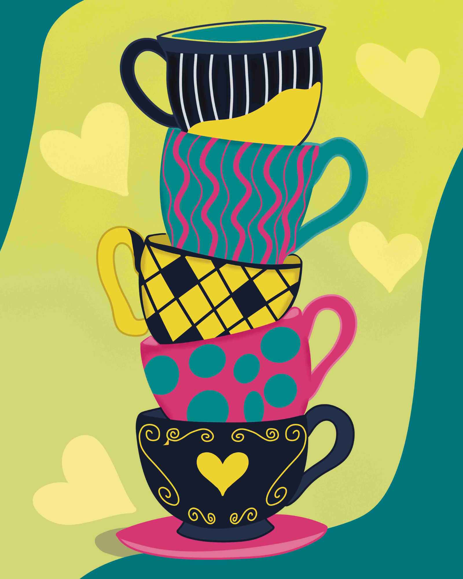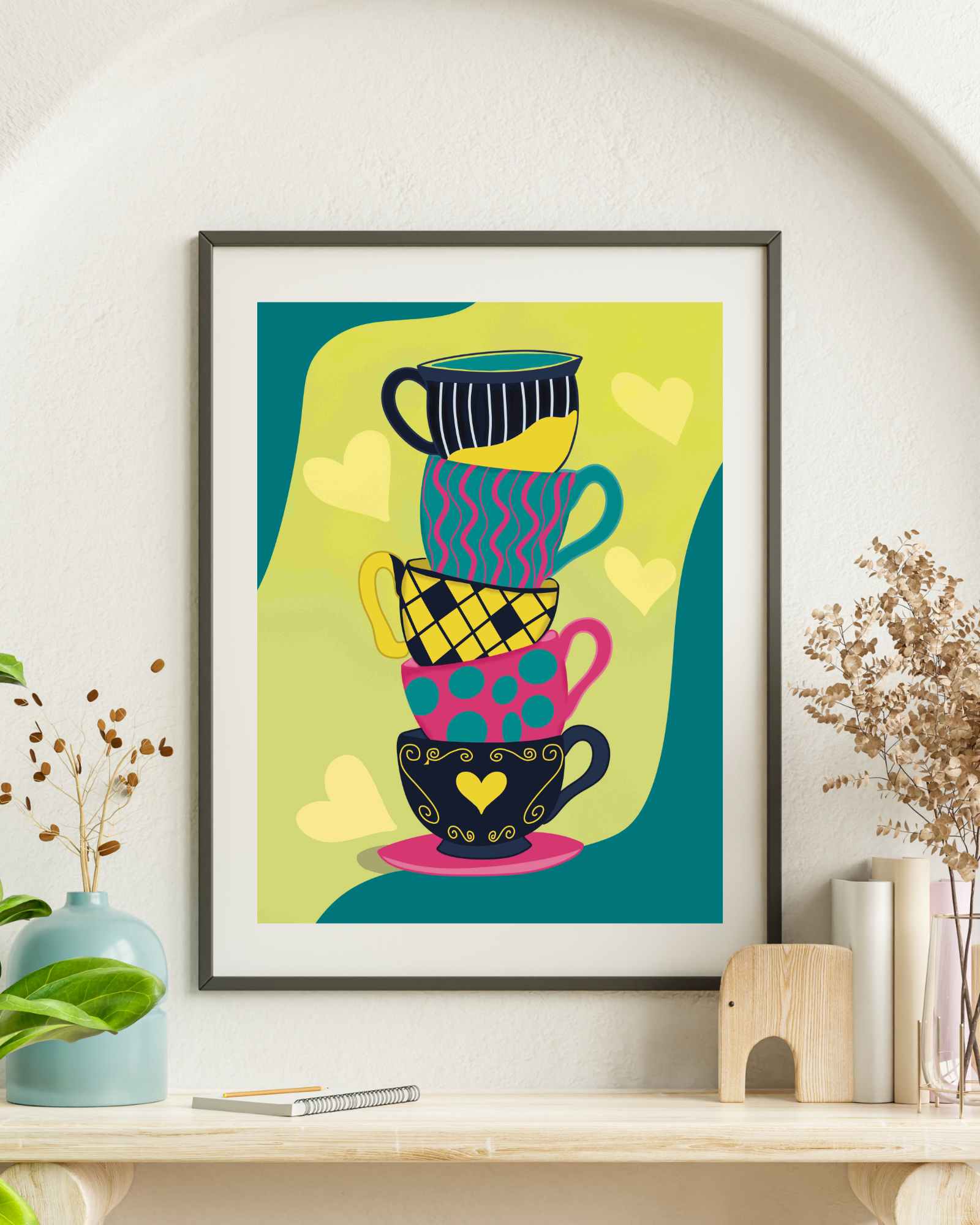 Celebrate your love of tea with this vibrant art print that captures the ritual of steeping, sipping, and savoring. With bright, layered colors and playful shapes, it brings warmth and energy to your kitchen or tea corner. A cheerful gift for tea lovers, herbalists, or anyone who finds comfort in a cozy cup.