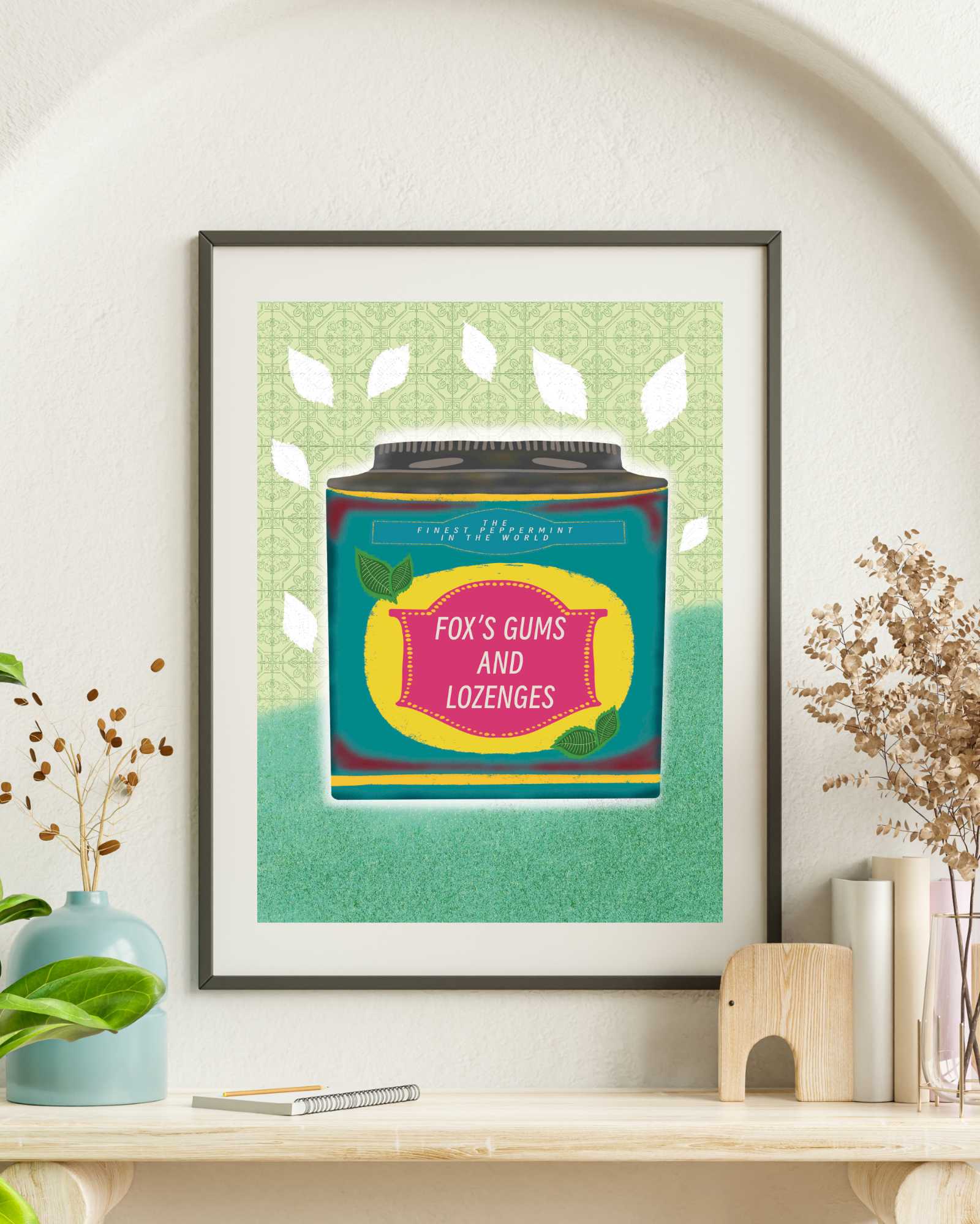 Step back in time with this charming Vintage Fox's Gums and Lozenges Art Print. Featuring an illustrated jar of Fox's Gums and Lozenges with a retro design, this artwork captures the nostalgic essence of classic confectionery. The vibrant colors and vintage-style typography make this print a delightful addition to any room, perfect for those who appreciate the timeless appeal of old-fashioned sweets.
