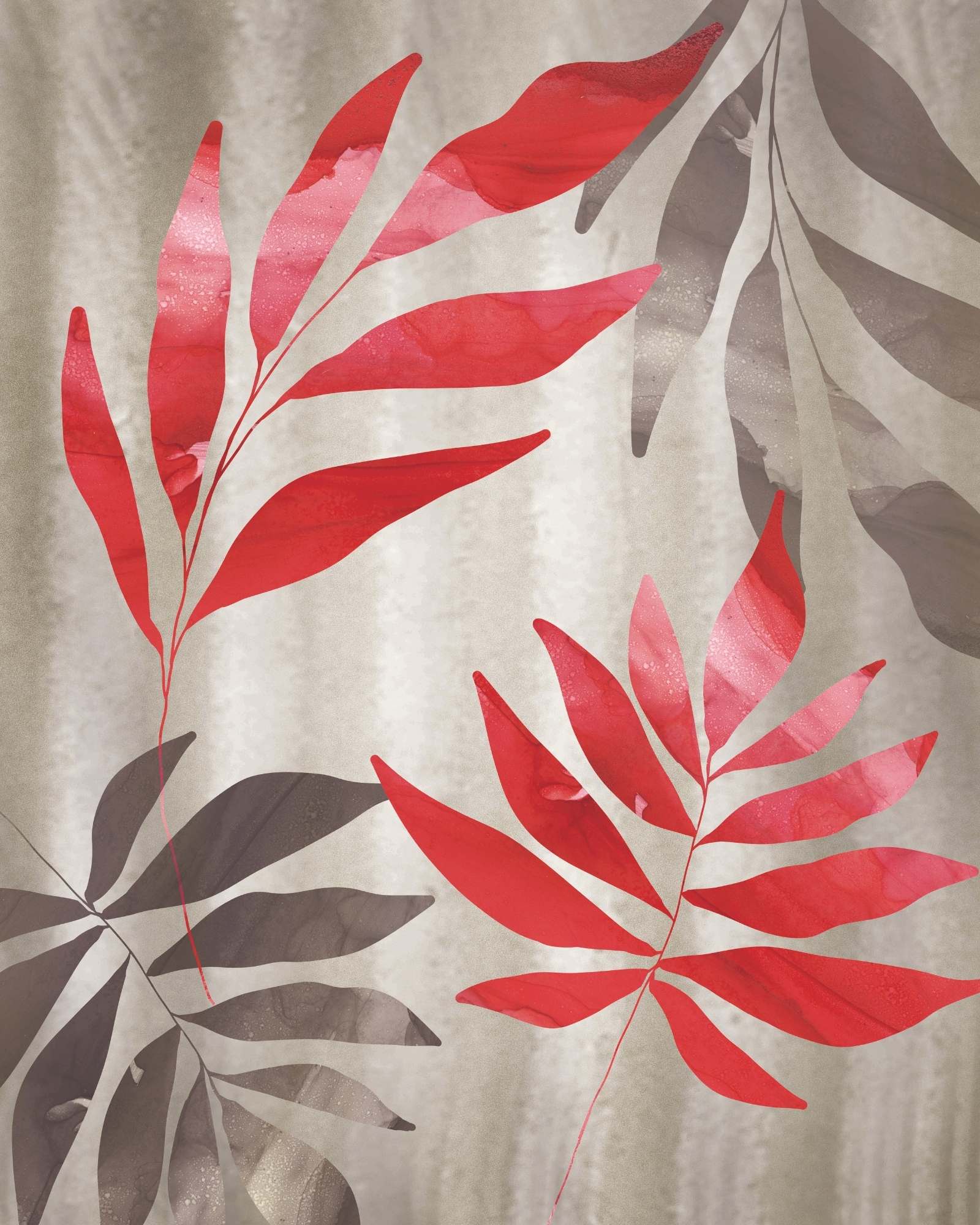 Whispers of Autumn is an evocative abstract art print that captures the fleeting beauty of autumnal leaves. The print features impressions of leaves in a palette that contrasts warm, rich reds with cool, shadowy grays, set against a textured backdrop reminiscent of vintage linen.